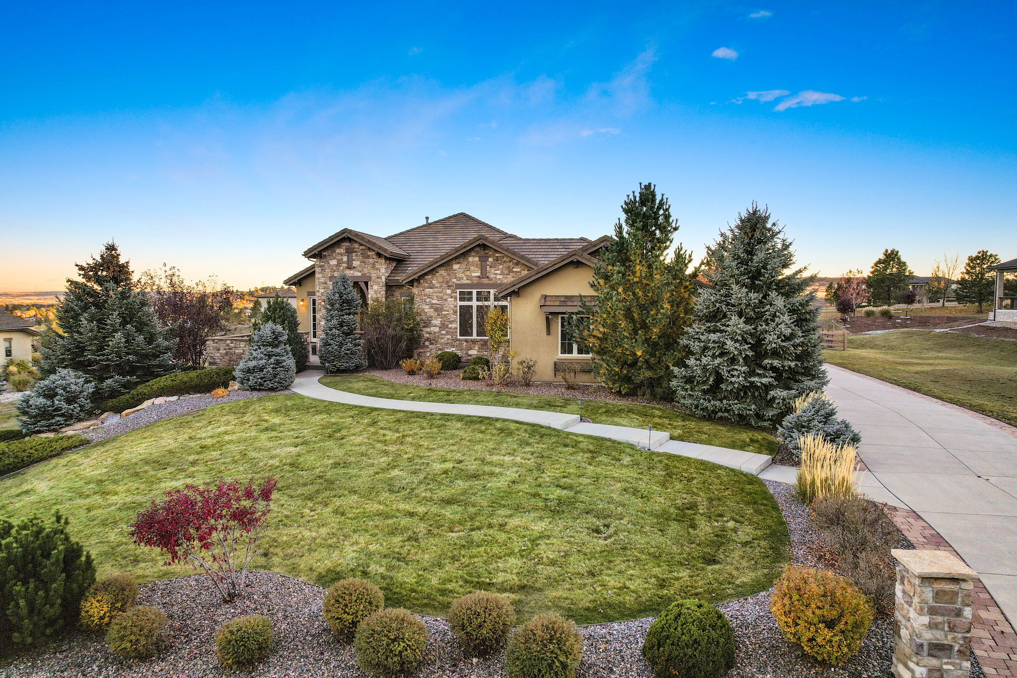 A masterpiece home built by revered Bainbridge Custom Homes in the renowned Pradera Golf Club. A rare ranch model home with the finest appointments and upgrades throughout – the superior quality speaks for itself. Bainbridge/Forest Glen custom home with the modern, bright, light and open style popular in today’s market but seldom found. Well maintained and gently lived in only part time - pride of ownership is obvious here. Secluded, private backyard buffered with an incredible water feature with no homes behind it.. Raised ceilings for that light, spacious, open atmosphere. Perfect open and seamless gourmet kitchen/family room for an ideal great room. Kitchen offers sunny eating room off to one side with views of the backyard and beyond. Upgraded throughout – nothing to do but move in and start enjoying this fabulous home. Also includes upgraded light fixtures, custom trim package, knotty alder wood throughout,ceilings fans, extensive wood flooring, beamed ceiling, expanded quiet, private patio with gorgeous views plus firepit and outdoor kitchen(Fontana pizza oven from Italy, wood fireplace, grill, sink, mini frig), raised lower level ceilings, large game room with wet bar, solid panel doors and the list just goes on. This is the home of your dreams as evidenced in the beautiful photographs. Attention to detail at every turn. Drive your private golf cart to the golf clubhouse mere blocks away for a round of golf, practice, dinner, exercise in the fitness center, watch a sports event, etc. Minutes to DTC, DIA, i-25, C-470, C-225, restaurants, shopping, 2 hospitals, Castle Rock, Parker and much more!